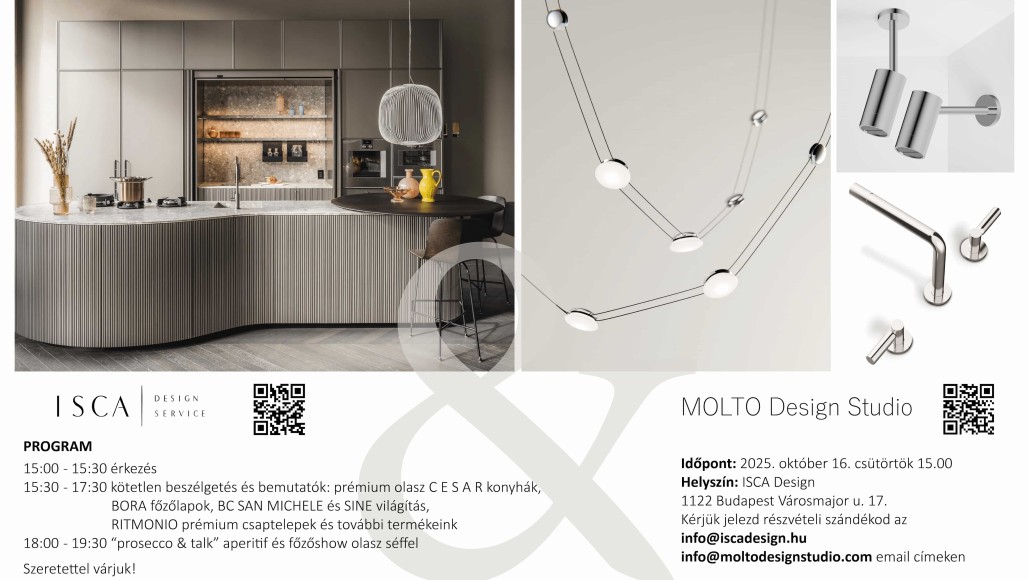 Az Isca Design Service és a MOLTO Design Studio eseményén a Made in Italy koncepció és prémium olasz lakberendezési márkák kerülnek fókuszba előadásokkal, aperitiffel és élő főzőshow-val, a határokon átívelő design szellemében.